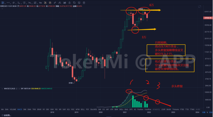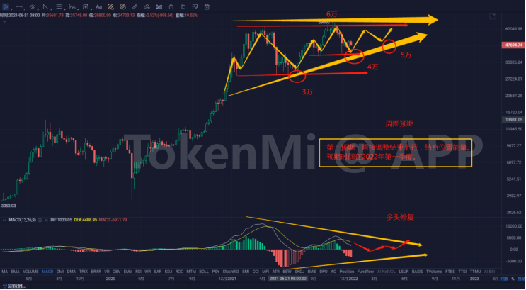 第三位置,位置是基础,也是技术走势里最直观的,3--6万美金,是后市调整的关键,位置不变调整不变。结合位置看能量,看时间。