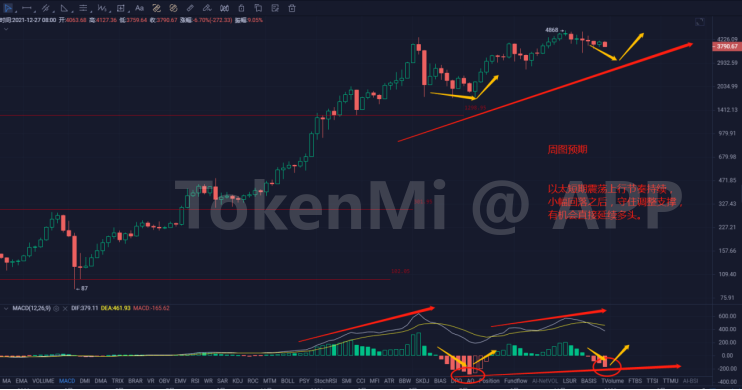 周线上的震荡上行有节奏变化,4000美金继续承压有机会试探3000美金,回落幅度加大,但是并未改变多头预期。周线再次金叉,有机会拉盘试探高点压力,后市能否持续多头走势,看位置能量同步。以太能不能走独立行情,需要在震荡走势的基础上,小周期细节给与支持。