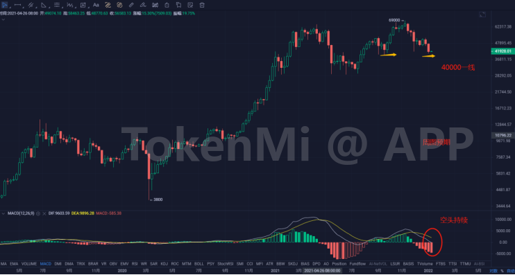 月线在69000美金冲高回落后开始调整,短期调整关注区间3--6万美金。
