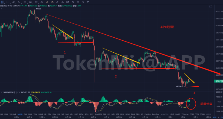 目前在4小时下行回落的节奏来看,并未改变,但是空头能量减弱后开始调整。还有结合40000美金支撑位置,接下来注意41000--43000美金小区间选择,有机会反弹再试探45000美金。反弹仅仅只是反弹,不能作为调整结束。