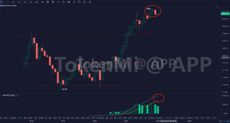 以太月线收阴,可以看到多头能量减弱,小周期持续调整,短期4500美金上不去,很难再直接走出独立行情,后市注意回落风险。
