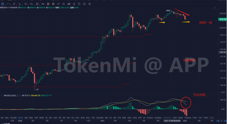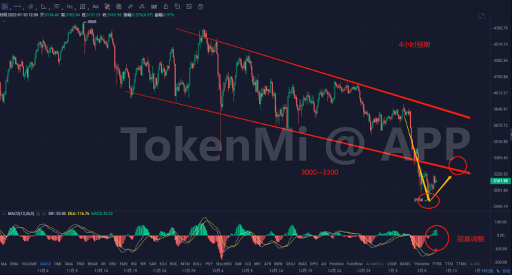此前4小时的预期是要加速回落,目前预期实现后开始调整,预期反弹试探短期高点压力。接下来主要关注小周期3000--3300美金一线,注意调整后的选择。守住低点支撑结合小周期调整后的多头能量,有机会反弹试探3500美金。