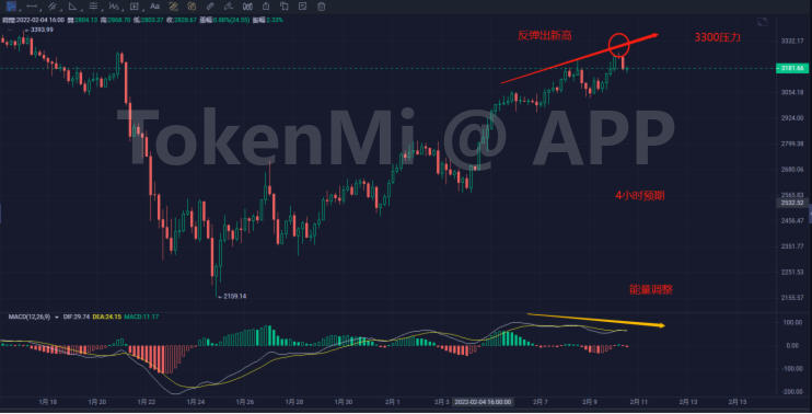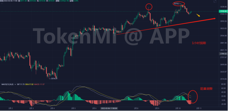 以太1小时的反弹上行的节奏还没有改变,但是4小时能量以及更多小周期能量不配合,注意高点3200--3300美金压力。日内结合高点压力,以高空为主,注意小幅回落预期,先看3000美金的试探情况。