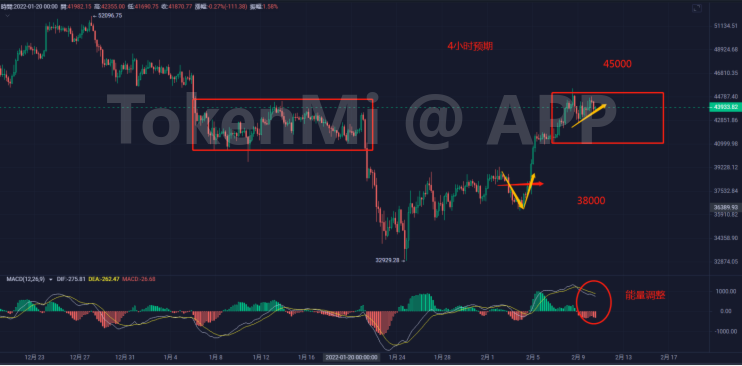 大饼4小时低位企稳反弹是在38000美金,目前的试探压力45000美金一线。小周期不配合反弹,能量不支持,小周期的42000--45000小区间预期要破位回落一小波。多注意小周期的细节。