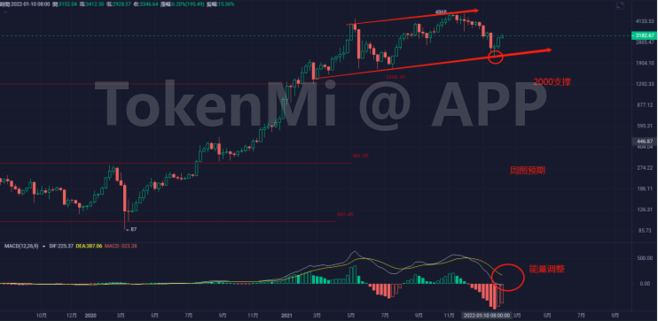 ETH:以太破位3000美金后加速回落,目前又重新回到这一位置。对于3000美金这一位置来说,短期调整可以上下看300美金左右的空间,结合小周期的细节,注意下2700--3300美金区间。