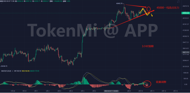 今日解析:大饼小周期调整42000--45000日内预期要走出来,小区间走出来,可以看上下3000美金左右的空间。短期关注45000美金压力,日线低位金叉的反弹能量减弱,小周期承压有回落的可能。日内结合小区间高点压力短空交易,42000美金破位再看4万美金一线。反之,45000美金继续上行先看48000美金一线。